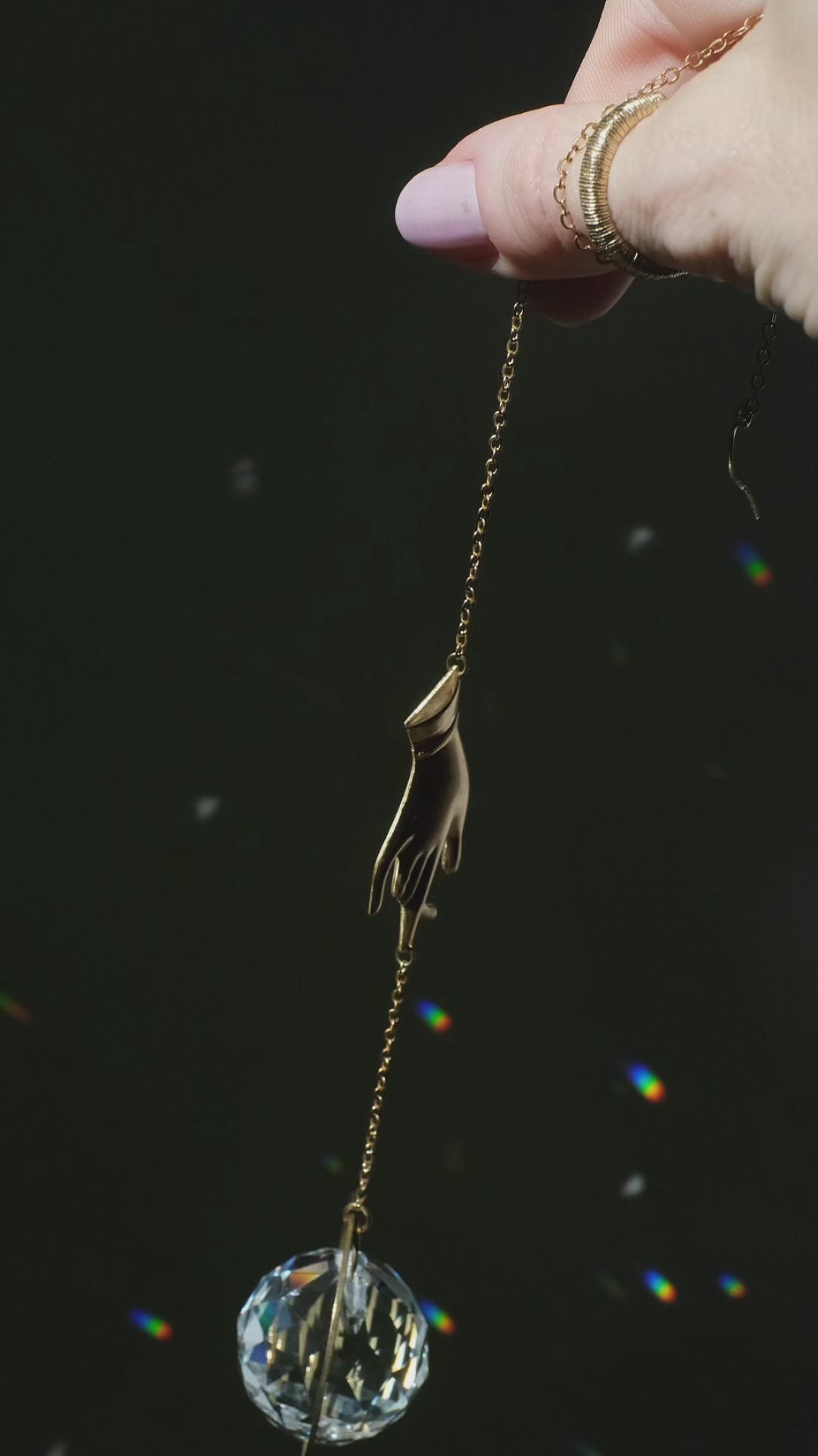 I raggi brillano nella sfera di cristallo e così i punti dell'arcobaleno sono distribuiti sulla parete.